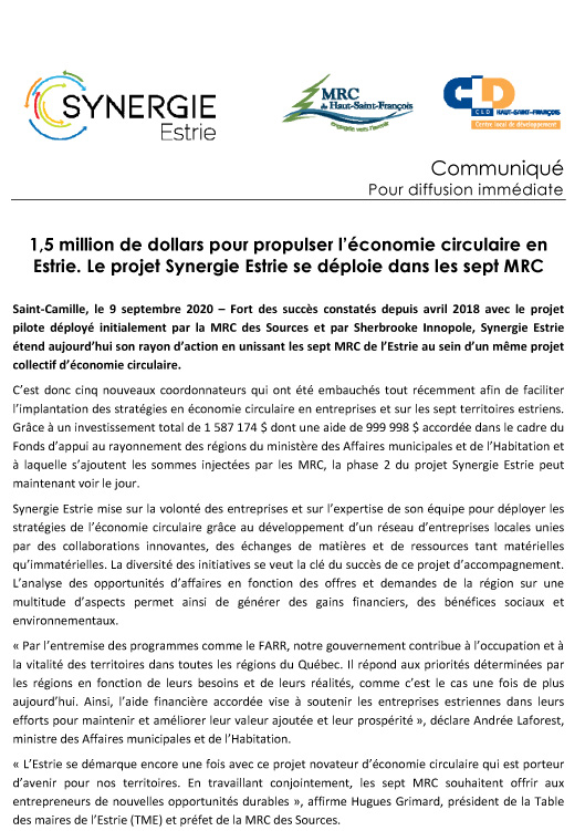 1,5 million de dollars pour propulser l'économie circulaire en Estrie. Le projet Synergie Estrie se déploie dans les sept MRC