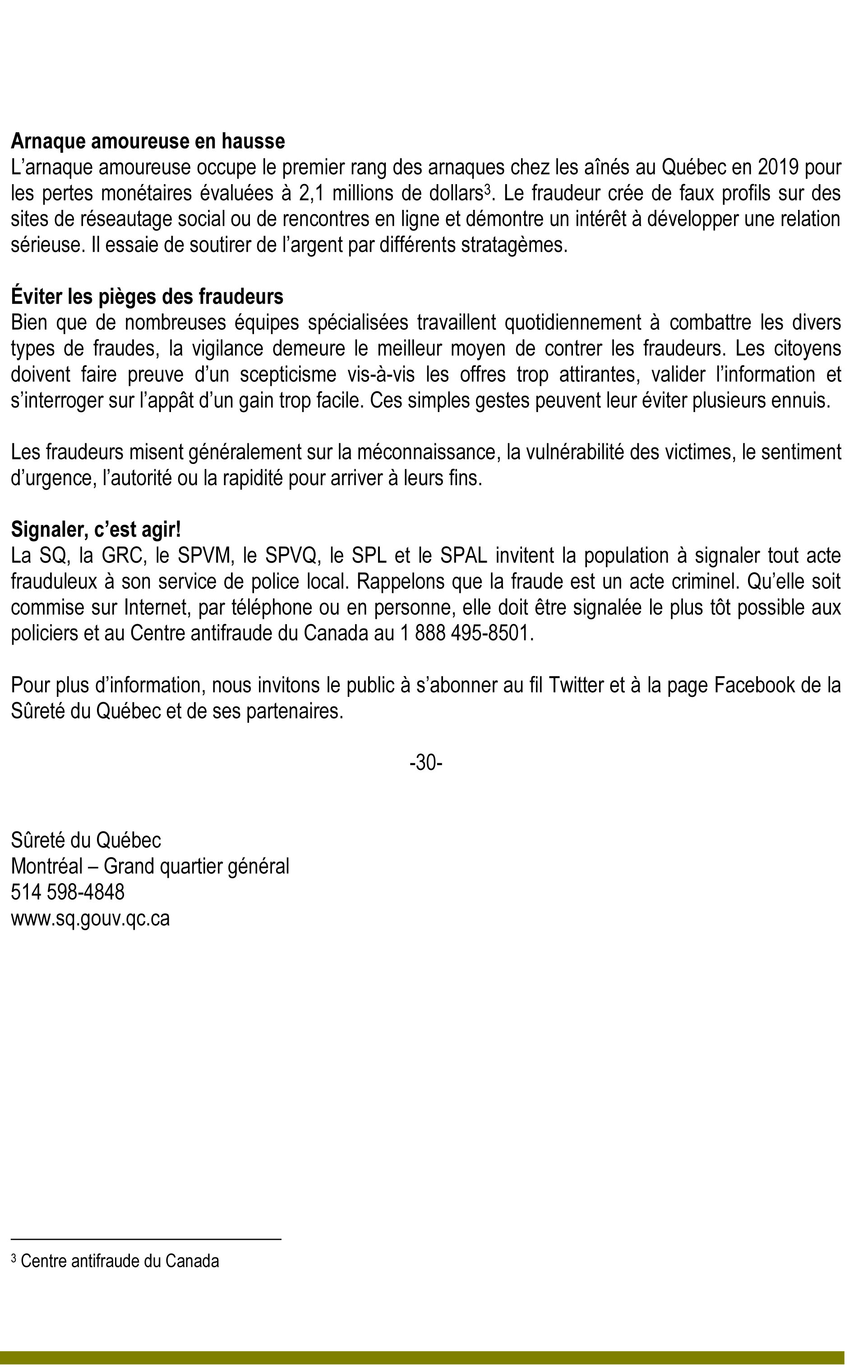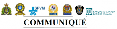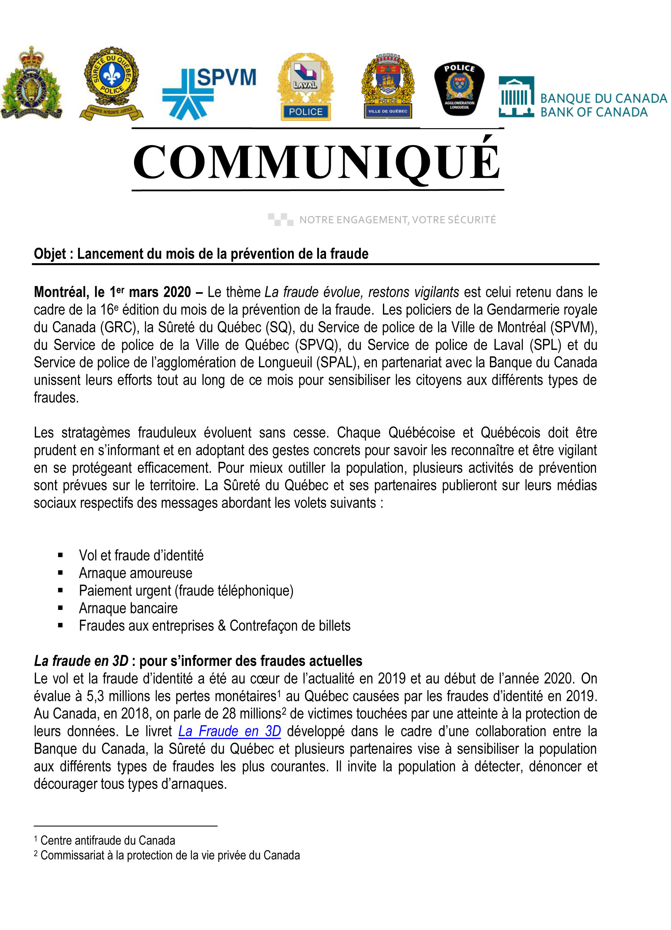 Montréal, le 1er mars 2020 – Le thème La fraude évolue, restons vigilants est celui retenu dans le cadre de la 16e édition du mois de la prévention de la fraude. Les policiers de la Gendarmerie royale du Canada (GRC), la Sûreté du Québec (SQ), du Service de police de la Ville de Montréal (SPVM), du Service de police de la Ville de Québec (SPVQ), du Service de police de Laval (SPL) et du Service de police de l'agglomération de Longueuil (SPAL), en partenariat avec la Banque du Canada unissent leurs efforts tout au long de ce mois pour sensibiliser les citoyens aux différents types de fraudes.