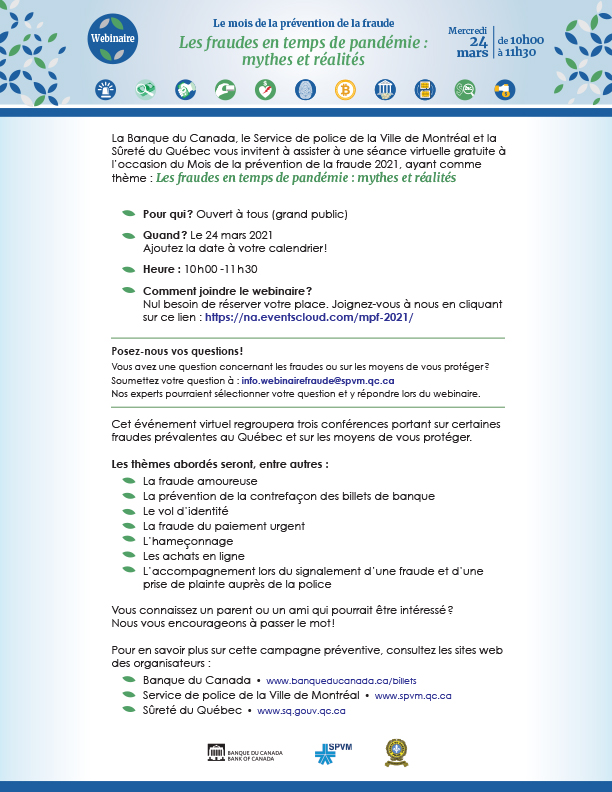 La Banque du Canada, le Service de police de la Ville de Montréal et la Sûreté du Québec vous invitent à assister à une séance virtuelle gratuite à l'occasion du Mois de la prévention de la fraude 2021, ayant comme thème : Les fraudes en temps de pandémie : mythes et réalités