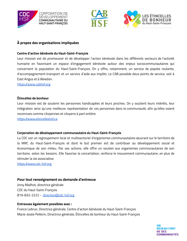 Nous sommes ravis de vous présenter un nouveau projet collectif, réalisé en collaboration entre la Corporation de développement communautaire du Haut-Saint-François, le Centre d'action bénévole du HSF et les Étincelles de bonheur.