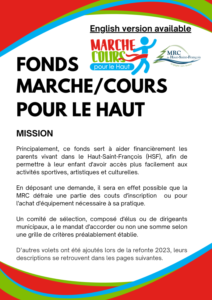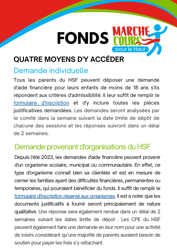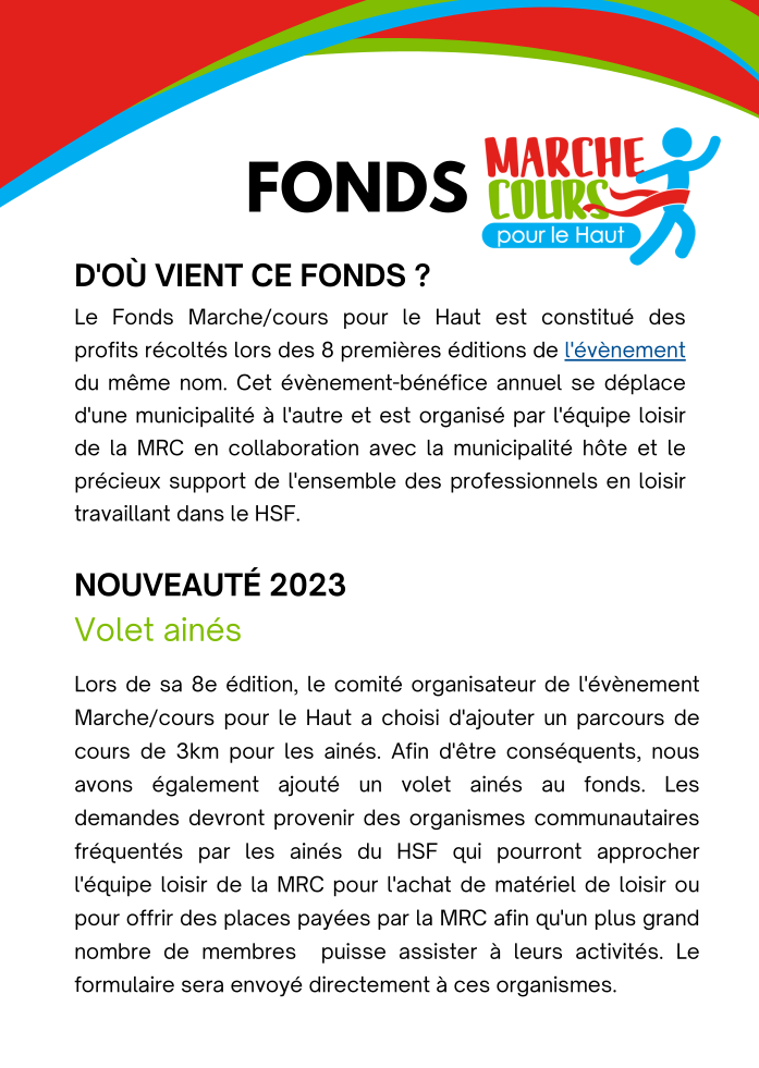 Ce message est pour vous informer que la période de dépôt au fonds Marche/cours pour le Haut est actuellement ouverte pour les activités hivernales.