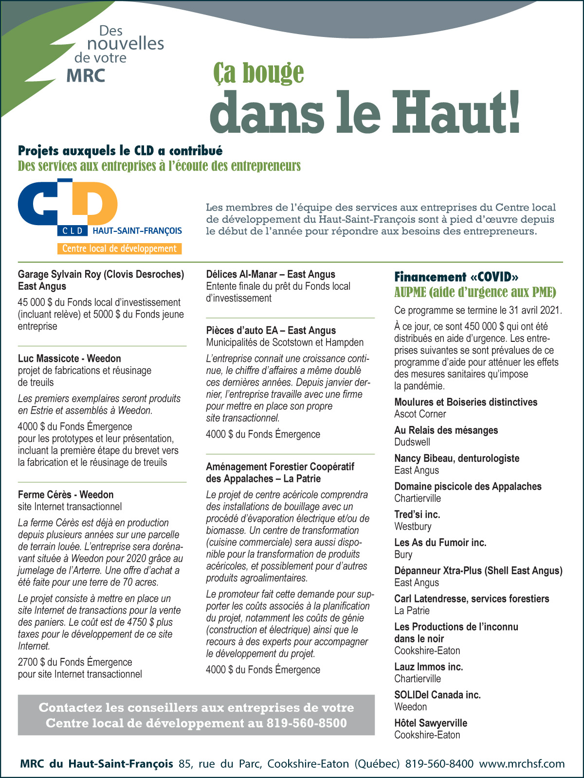 Les membres de l'équipe des services aux entreprises du Centre local de développement du Haut-Saint-François sont à pied d'œuvre depuis le début de l'année pour répondre aux besoins des entrepreneurs.