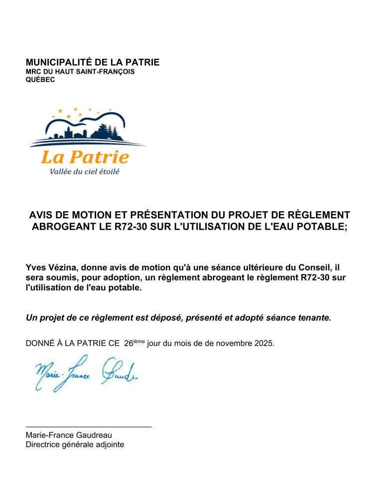 Yves Vézina, donne avis de motion qu'à une séance ultérieure du Conseil, il sera soumis, pour adoption, un règlement abrogeant le règlement R72-30 sur l'utilisation de l'eau potable.