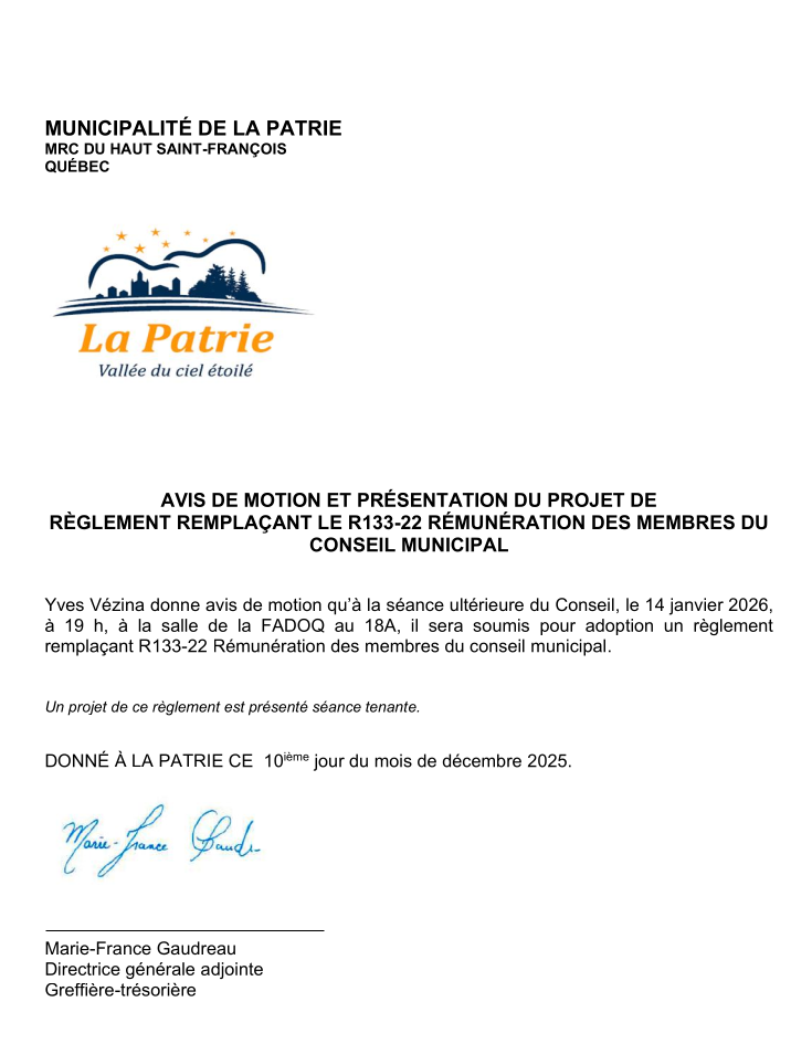 AVIS DE MOTION ET PRÉSENTATION DU PROJET DE RÈGLEMENT REMPLAÇANT LE R133-22 RÉMUNÉRATION DES MEMBRES DU CONSEIL MUNICIPAL.