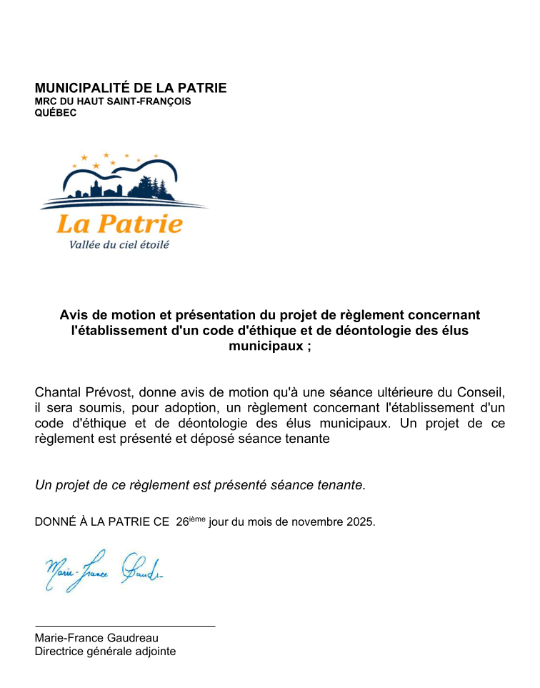 Chantal Prévost, donne avis de motion qu'à une séance ultérieure du Conseil, il sera soumis, pour adoption, un règlement concernant l'établissement d'un code d'éthique et de déontologie des élus municipaux. Un projet de ce règlement est présenté et déposé séance tenante.