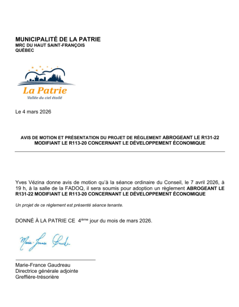 AVIS DE MOTION ET PRÉSENTATION DU PROJET DE RÈGLEMENT ABROGEANT LE R131-22 MODIFIANT LE R113-20 CONCERNANT LE DÉVELOPPEMENT ÉCONOMIQUE
