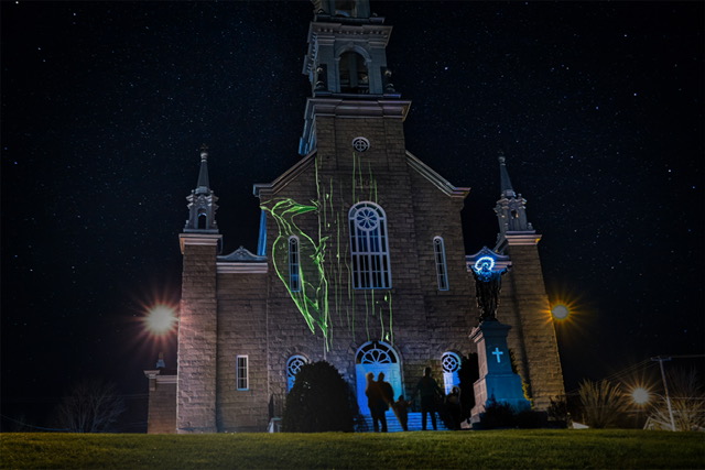 À La Patrie, l'église Saint-Pierre devient un écran architectural spectaculaire, alors qu'à Scotstown, la nature elle se transforme en scène vivante au parc Walter-Mackenzie.