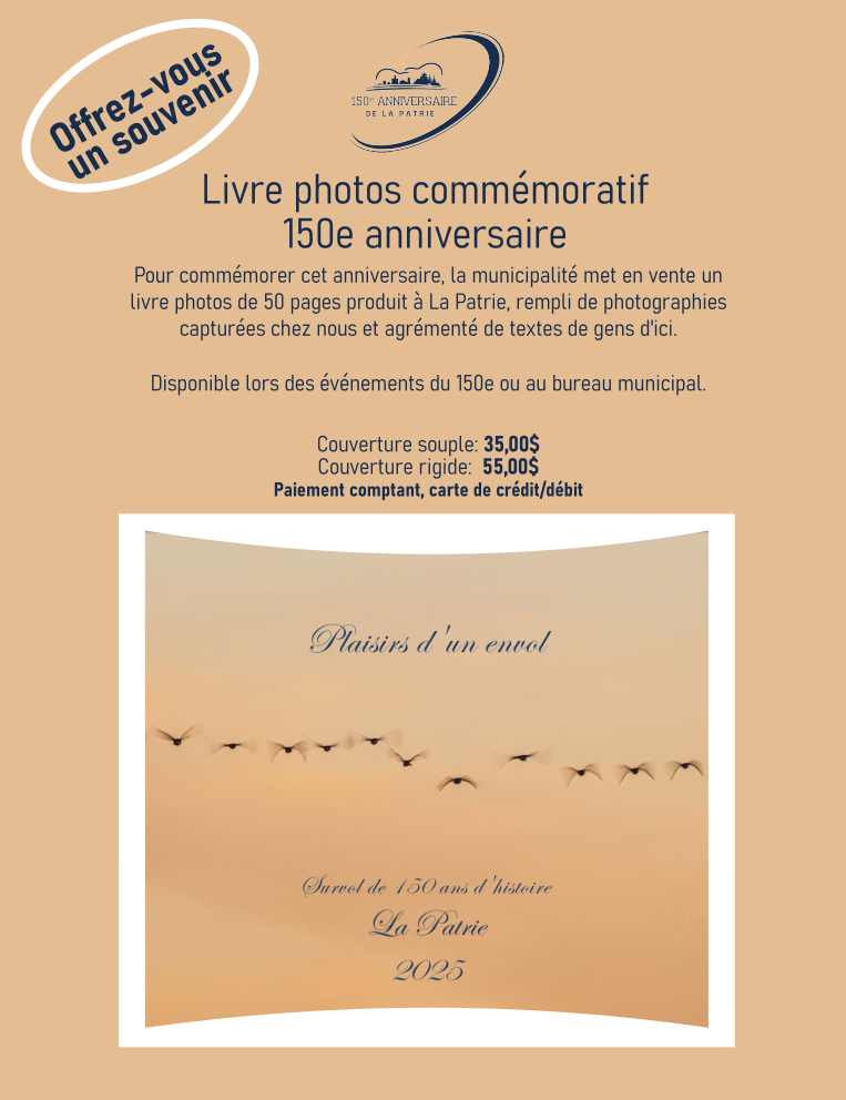 Pour commémorer cet anniversaire, la municipalité met en vente un livre photos de 50 pages produit à La Patrie, rempli de photographies capturées chez nous et agrémenté de textes de gens d'ici.