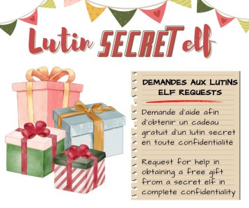 The goal of the Secret Elf sponsorship program is to enable children in the Haut-Saint-François MRC to be sponsored by a secret elf, in order to receive a gift for the holiday season, in complete confidentiality.