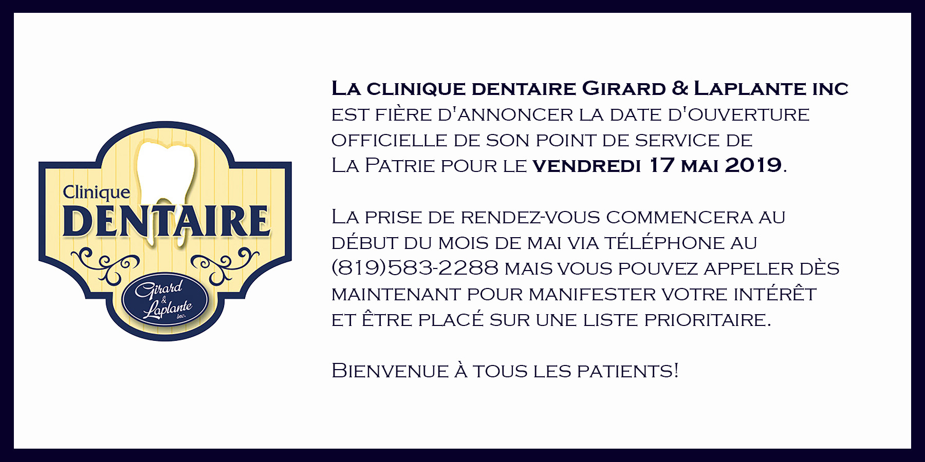 La clinique dentaire Girard & Laplante inc est fière d'annoncer la date d'ouverture officielle de son point de service de La Patrie pour le vendredi 17 mai 2019.