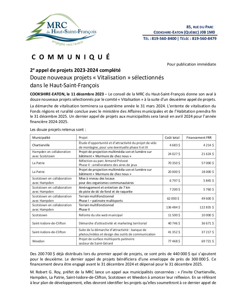 Douze nouveaux projets « Vitalisation » sélectionnés dans le Haut-Saint-François.