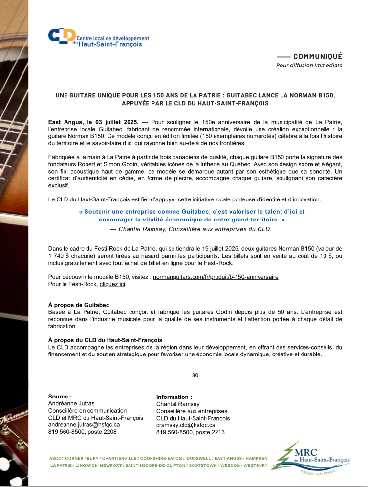 guitare Norman B150. Ce modèle conçu en édition limitée (150 exemplaires numérotés) célèbre à la fois l'histoire du territoire et le savoir-faire d'ici qui rayonne bien au-delà de nos frontières ...